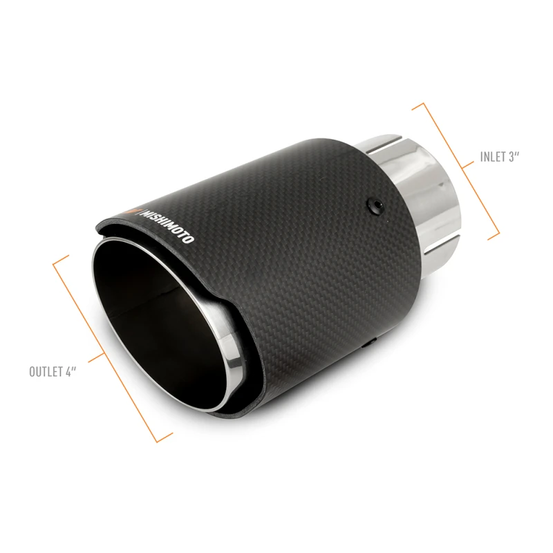 Elevate your vehicle's exhaust system with the Mishimoto Carbon Fiber Muffler Tip. Constructed from 304 stainless-steel with a sleek carbon fiber shroud, this tip combines style and durability. With a polished finish and 3in inlet, 4in outlet design, it's the perfect addition to your ride.