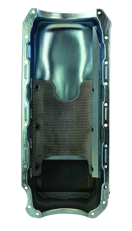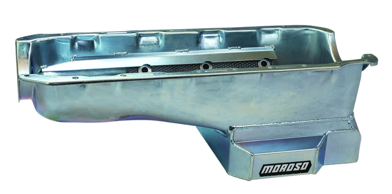 This Moroso oil pan is designed for high-performance applications, featuring a kicked-out sump design to enhance oil capacity and improve engine efficiency. It is crafted from durable steel and includes a windage tray for better oil control.