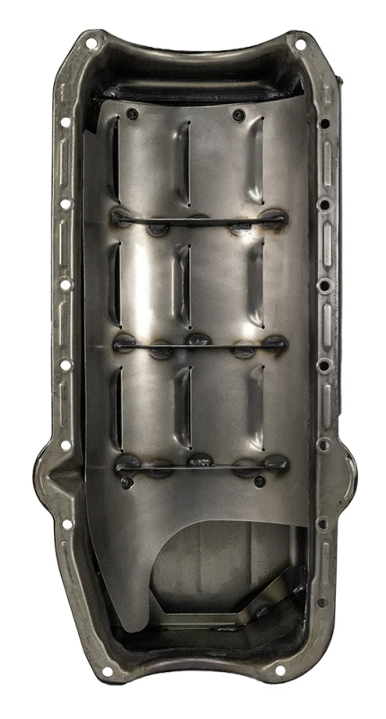 This Moroso oil pan is designed for high-performance applications, specifically for pre-1980 Chevrolet Small Block engines and Dart Little M engine blocks. It features a wet sump design with a 7-quart capacity and is 8.25 inches deep, making it ideal for drag racing and other motorsport applications.
