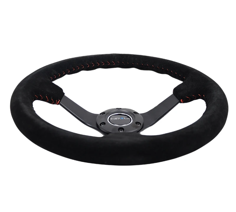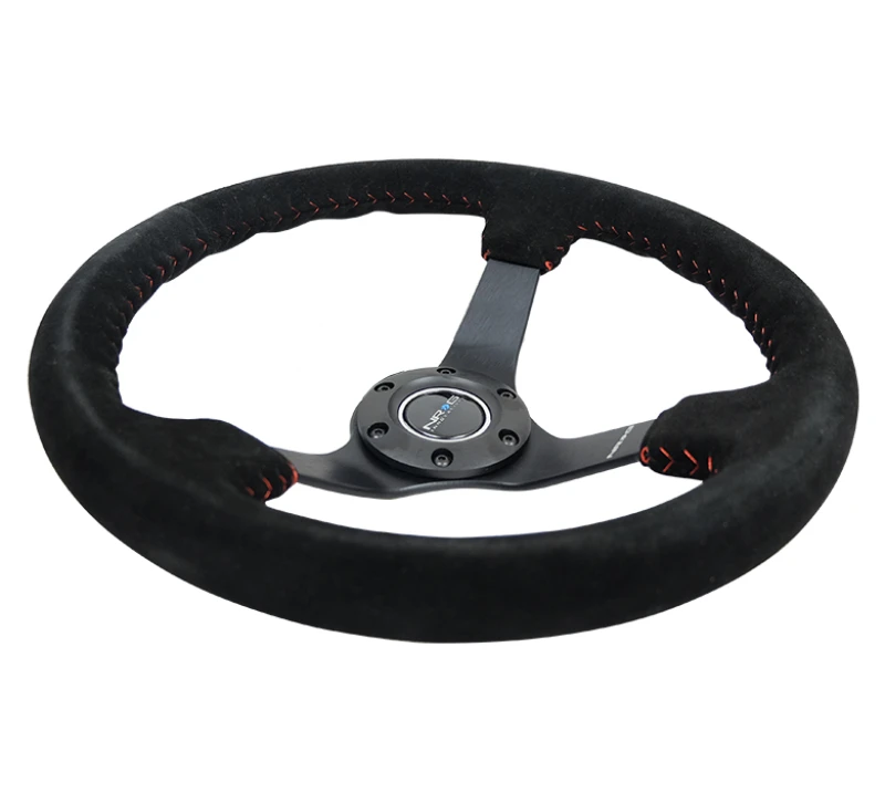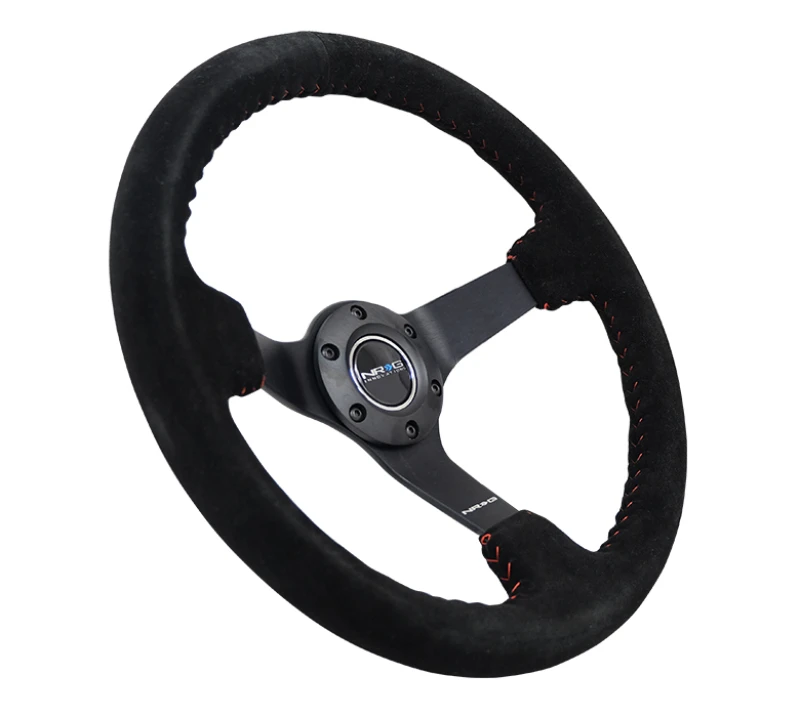 NRG Reinforced Steering Wheel (350mm / 3in. Deep) Black Suede with Red BBall Stitch and 5mm Matte Black Spokes