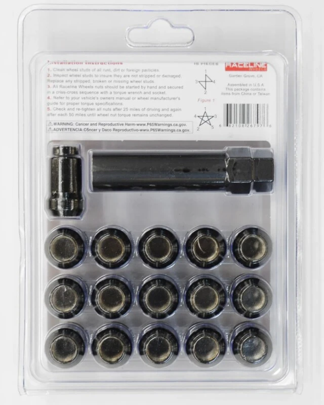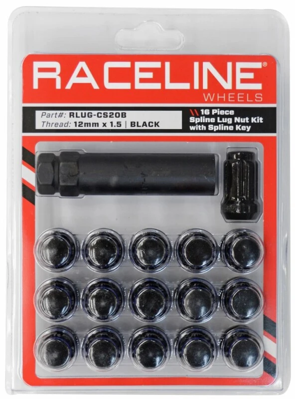 Raceline Spline Lug Nut Kit with Spline Key 12 x 1.5 - 16 Pack - Black