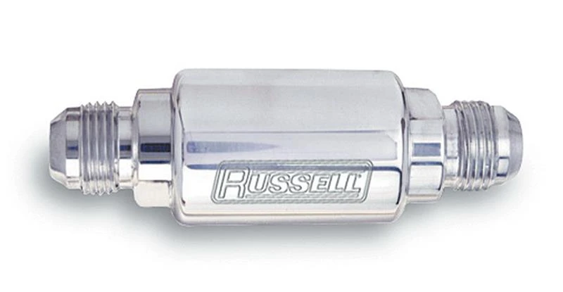 Upgrade your fuel system with Russell's high-performance fuel filter, designed for high-volume carb or injected engines up to 1000 HP. This competition fuel filter features a polished aluminum finish and a disc-type element that filters down to 40 microns.