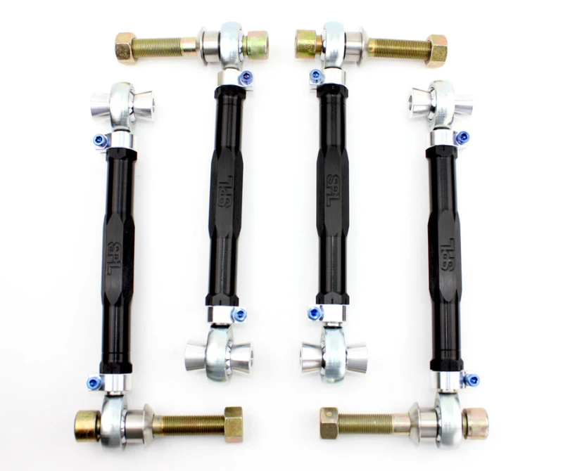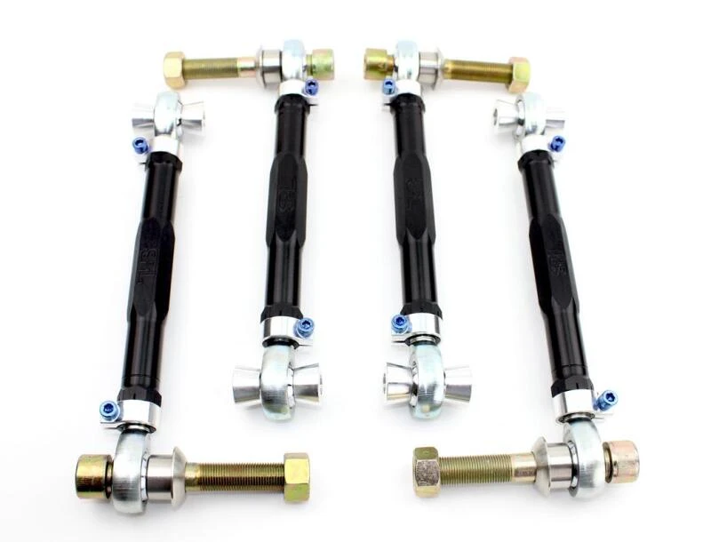 Featuring black anodized and gun-drilled 2024 aluminum links, 6061-T6 aluminum rotating clamps, titanium socket head cap screws, tapered stainless steel knuckle mount spacers, and low-friction 3-piece Teflon-lined FK rod ends, these arms are designed to provide a wider range of adjustment and improved performance.