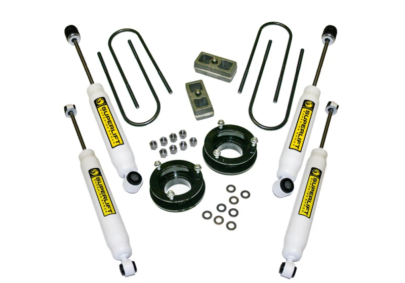 This 2-inch suspension lift kit is designed for the 2003-2013 Dodge Ram 2500, 2003-2012 Ram 3500, and 2006-2013 Ram 1500 Mega Cab. It includes coil spacers, front and rear Superlift Shadow shocks, and rear blocks with U-bolts, enhancing vehicle height and improving handling.
