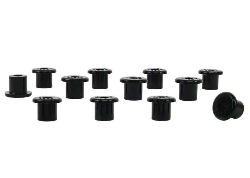A critical service item for any leaf sprung vehicle. High kilometres and heavy load carrying causes excessive wear on rubber bushings. Whiteline's signature black bushings are made tough and offer outstanding abrasion resistance, high load bearing capability (4WD's, utes and towing), flexibility, increased tensile strength and chemical resistance to oil, grease, ozone and weathering.