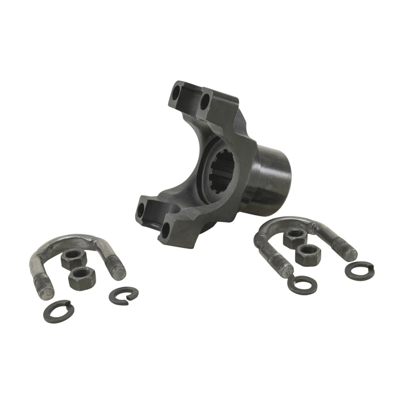 This Yukon Gear Extra HD Billet Yoke is designed for Chrysler 8.75-inch differentials with a 10 spline pinion and a 1350 U-joint size. It features an outside snap ring design, a 3.625-inch snap ring span, and a 1.188-inch cap diameter. Constructed from billet steel, it uses U-bolts for secure installation. All Yukon yokes come with a one-year warranty against manufacturing defects.
