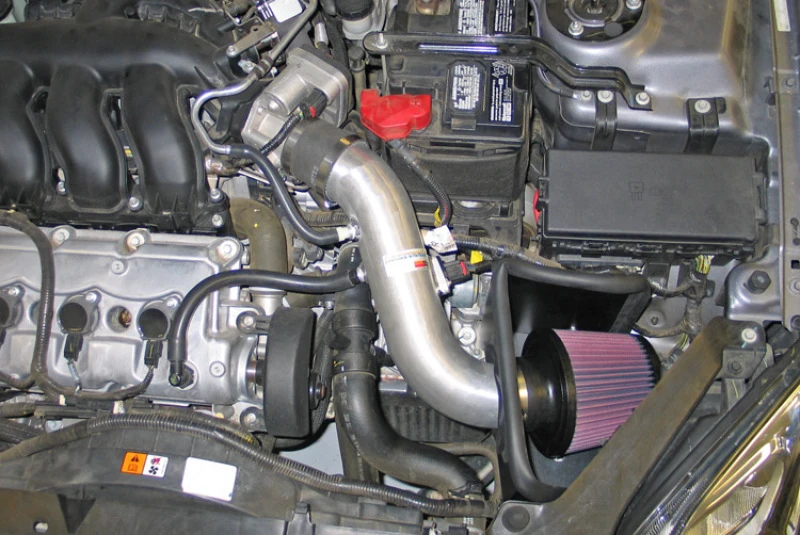 Das 69-3515TS Einlasssystem kommt mit einem schwarzen Gummikugel- K&N-Hochleistungs-Luftfilter und einem Hitzeschild, der in den vorherigen Luftbox-Raum installiert wird. Die Luft wird durch das Einlassrohr in den Motor-Throttle-Body geleitet, um eine garantierte Leistungssteigerung zu erzielen.