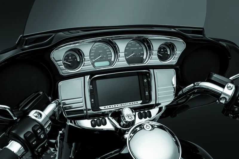 Dieses stilvolle Deluxe Trim Kit ergänzt perfekt andere Tri-Line Zubehörteile und ist kompatibel mit den 4.3" oder 6.5" Boom! Infotainment-Systemen. Es umfasst Abdeckungen für die angrenzende Medienklappe und Seitenverkleidung, die Deinem Motorrad ein edles Chrom-Finish verleihen.