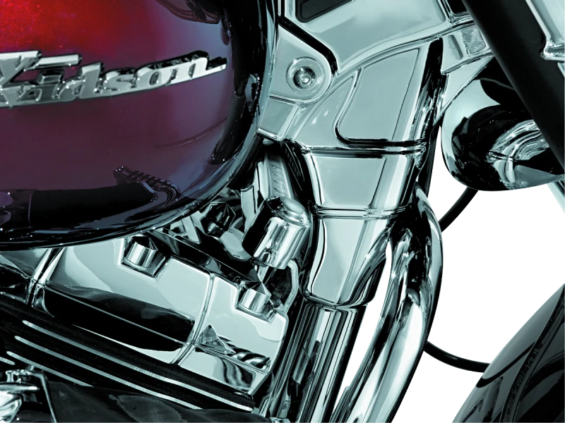 Das Kuryakyn Front Upper Stabilizer Link Cover wertet das Erscheinungsbild deines Motorrads deutlich auf. Es kaschiert den vorderen oberen Stabilisator, der bei Touring-Modellen zwar für bessere Vibrationskontrolle sorgt, optisch aber nicht überzeugt. Die einfache Montage gelingt ohne Werkzeug und verleiht deinem Bike einen glänzenden, chromfarbenen Akzent.