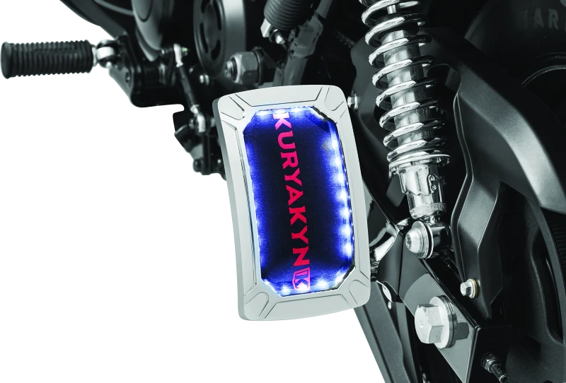 Der Kuryakyn Nova Nummernschildhalter besticht durch ein nahtloses Design ohne sichtbare Befestigungen und eine umlaufende LED-Beleuchtung, die für erhöhte Sichtbarkeit sorgt. Er ist speziell für die seitliche Montage konzipiert und bietet eine elegante und funktionale Lösung für dein Motorrad.