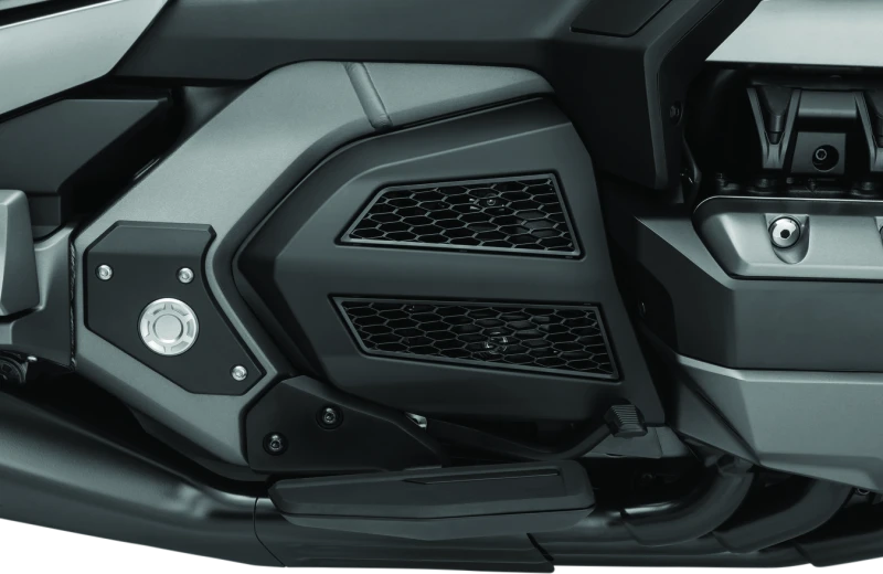 Die Kuryakyn Omni Transmission Covers in Satin Schwarz verdecken den freiliegenden Motor und das Getriebe für einen sauberen Look und fügen dabei stilvolle Akzente hinzu. Die Abdeckungen verfügen über stilisierte Mesh-Einsätze, die das Design der originalen Lüftungsgitter der Verkleidung nachahmen und so ein harmonisches Gesamtbild schaffen.
