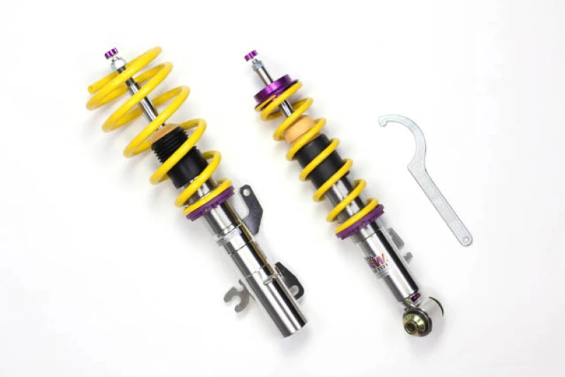 Unvergleichliche Straßenleistung, gezüchtet aus Motorsport-Erbe. Das KW Variant 3 Coilover-Fahrwerk-Kit bietet eine signifikante Verbesserung auf der Straße, dank hochwertiger Dämpfer, Federn und Elastomer-Federelementen.