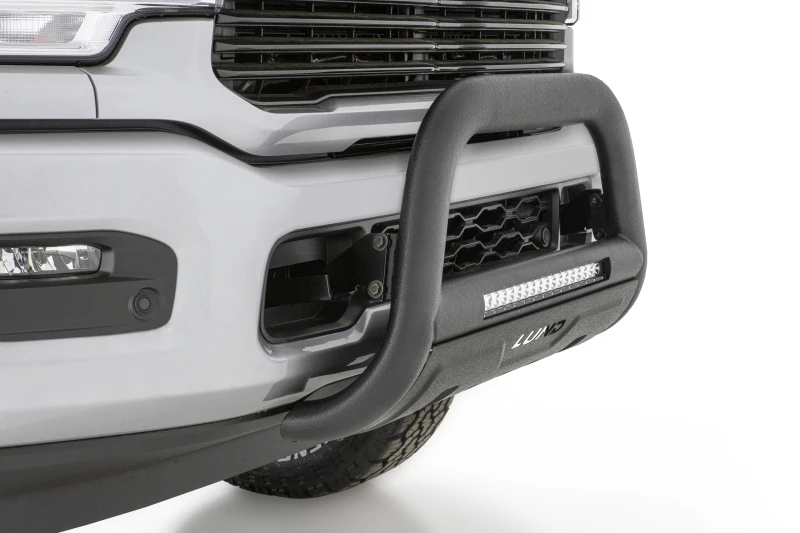 Erhöhe den Schutz deines Trucks mit dem Lund 16-17 Nissan Titan XD Bull Bar mit Licht und Verkabelung - Schwarz. Dieser schwere Bull Bar bietet 3,5 Zoll ovale Stahlrohre, die deinen Truck vor fliegenden Trümmern schützen.