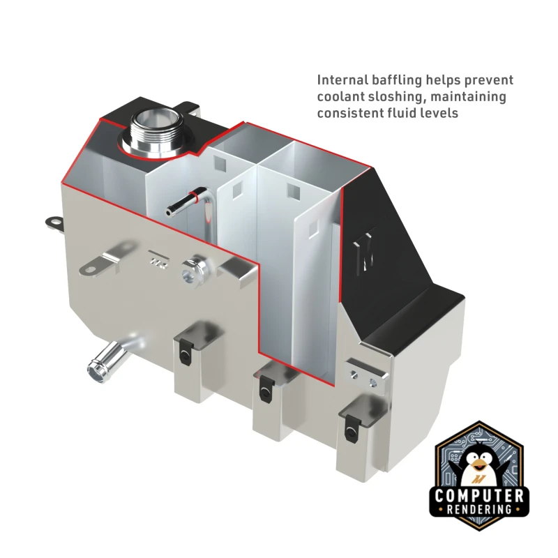 - Interne Baffeln halten das Kühlmittel nahe dem Überlauf-Port während des aggressiven Fahrens, wodurch die Luft im Kühlsystem verhindert wird