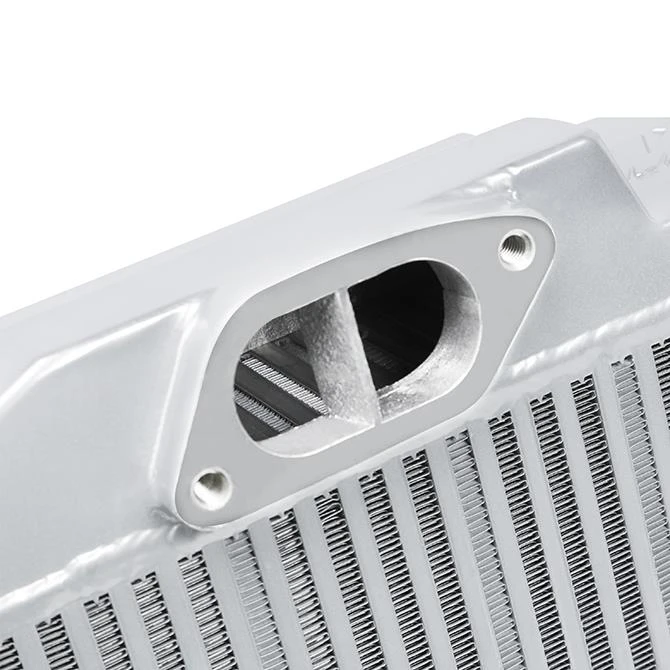 Dieser Intercooler verwendet robuste Aluminium-Endtanks, die durch ein hochleistungsfähiges, dichtes Bar-and-Plate-Kernstück TIG-geschweißt sind. Der Mishimoto-Intercooler hat einen 3,75 Zoll dicken Kern und ein Gesamtvolumen von 584 in3.