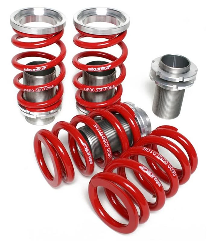 Dieses Kit enthält harteloxierte, CNC-gefräste Aluminiumhülsen, geschmiedete Federlager, SAE 9254V-Rennfedern und Montagehardware, die eine Absenkung von bis zu drei Zoll (manchmal mehr) ermöglicht. Entwickelt für die Verwendung mit OEM- oder Aftermarket-Stoßdämpfern, ermöglichen Skunk2's einstellbare Coilover-Hülsen den unabhängigen Austausch von Stoßdämpfern, was bedeutet, dass Fahrwerksysteme in Stufen aufgerüstet werden können.