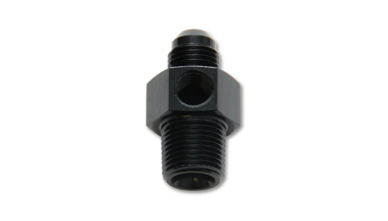 Verbessere dein Ölsystem mit Vibrant Performance's hochwertigen Adapter-Fittings. Dieses -6AN-Männlich-auf-3/8-Zoll-NPT-Männlich-Union-Adapter-Fitting verfügt über einen 1/8-Zoll-NPT-Anschluss und ist aus leichtem 6061-Aluminiumlegierung gefertigt.